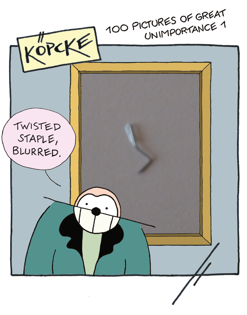 Comic-Protagonist Köpcke führt ein Doppelleben. Immer dann, wenn er nicht in einem der Panel herumturnt, die für ihn die Welt bedeuten, betätigt er sich als Kunstsammler! Erstaunlich: So wie echte Menschen gemalte Bilder sammeln, sammelt der gemalte Köpcke Fotos, also „echte Bilder“.