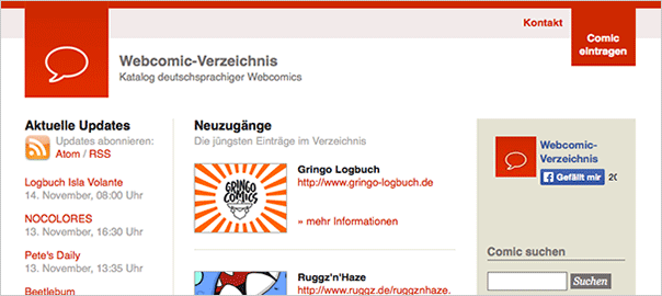 Den Anfang macht heute das „Webcomic-Verzeichnis“, das Manfred Kooistra 2009 ins Leben rief.* Ich empfehle es aus einem einfachen Grund: Es gibt keine bessere Möglichkeit, sich einen ersten Eindruck von der Vielfalt der deutschen Webcomic-Landschaft zu verschaffen. Gleich auf der Startseite werden die jüngsten Einträge im Verzeichnis gelistet. Daneben gibt es natürlich eine Suchfunktion sowie eine Liste „Comics nach Genre“.